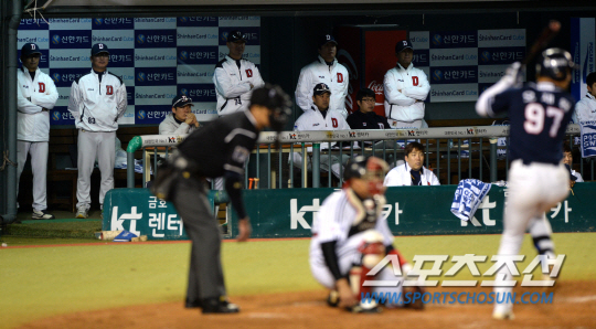2013 프로야구 플레이오프 2차전 LG와 두산의 경기가 17일 잠실구장에서 열렸다. 두산 김진욱 감독과 코칭스탭이 2대0으로 뒤진 7회초 오재원의 타격을 지켜보고 있다. 잠실=허상욱 기자 wook@sportschosun.com/2013.10.17/