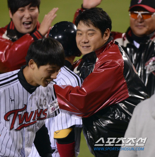 16일 오후 서울 잠실야구장에서 2013 프로야구 플레이오프 두산과 LG의 경기가 열렸다. 1회말 무사 1루서 LG 이병규(7)가 좌중월 2점 홈런을 친 후 덕아웃에서 류제국과 환호하고 있다. 잠실=김경민 기자 kyungmin@sportschosun.com / 2013.10.16.