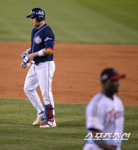 17일 오후 서울 잠실야구장에서 2013 프로야구 플레이오프 2차전 두산과 LG의 경기가 열렸다. 5회말 1사 1,2루서 두산 양의지가 유격수 앞 병살타를 친 후 아쉬워하며 덕아웃으로 향하고 있다. 잠실=김경민 기자 kyungmin@sportschosun.com / 2013.10.17.