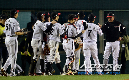 17일 잠실구장에서 LG와 두산이 2013프로야구 플레이오프 2차전 경기를 펼쳤다. LG가 두산에 2대0 승리를 거두며 시리즈를 1-1 원점으로 돌렸다. 경기 종료 후 김기태 감독이 리즈와 하이파이브를 나누고 있다. 잠실=송정헌 기자 songs@sportschosun.com/2013.10.17
