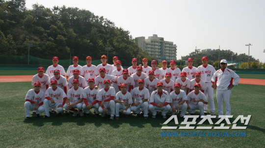 | ◇프로야구 제10구단 KT 선수단이 현재 진행 중인 남해 훈련 캠프에서 조범현 감독(맨 오른쪽)과 함께 단체 사진을 찍었다. 사진제공=KT 위즈 야구단 |