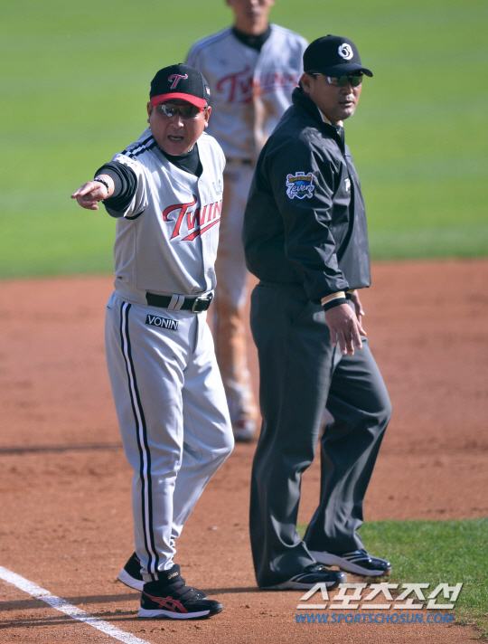 19일 오후 서울 잠실야구장에서 2013 프로야구 플레이오프 3차전 두산과 LG의 경기가 열렸다. 3회말 무사 만루서 두산 김현수의 1루수 앞 땅볼 때 실책과 주루 방해로 2실점 하자 LG 김기태 감독이 심판진에게 항의하고 있다.잠실=김경민 기자 kyungmin@sportschosun.com / 2013.10.19.