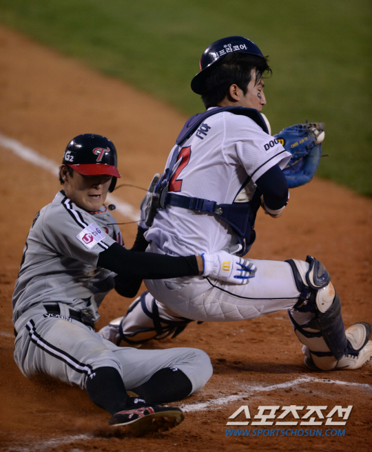 관건이 된 것은 두 번째 민병헌의 보살 장면. 2사 주자 2루 상황서 이병규(9번)의 우전안타 때 2루 주자 문선재가 홈에 파고들었으나 두산 포수 최재훈의 블로킹에 막혀 문선재는 아웃이 되고 말았다. 송구가 포수 좌측으로 쏠린 감이 있었지만 최재훈이 길목을 잘 막고 있었고, 문선재의 보디체크에도 최재훈이 꿈쩍하지 않으며 마지막 아웃카운트를 만들어냈다. 전 상황에서 이대형과 충돌한 데 이어 두 번 연속 홈 충돌을 당한 최재훈은 고통을 호소하며 덕아웃으로 들어갔다. 다행히 큰 부상은 아니었다.