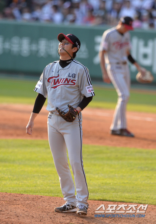 LG 선발 우규민이 승리투수 요건을 갖추지 못하고 마운드를 내려갔다. 실책과 후속투수의 폭투로 땅을 쳤다.