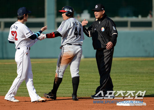 2013 프로야구 플레이오프 4차전 두산과 LG의 경기가 20일 잠실구장에서 열렸다. 3회초 1사 1루 LG 박용택의 내야땅볼때 1루로 슬라이딩을 하던 1루주자 윤요섭과 두산 유격수 김재호가 신경전을 벌이고 있다. 잠실=허상욱 기자 wook@sportschosun.com/2013.10.20/