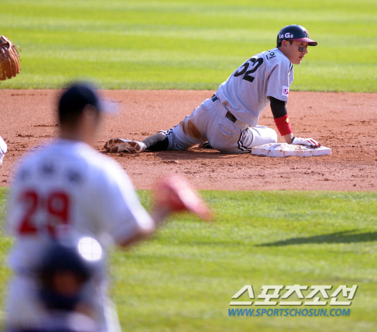 20일 오후 서울 잠실야구장에서 2013 프로야구 플레이오프 4차전 두산과 LG의 경기가 열렸다. 3회초 무사 1루서 1루주자 손주인이 윤요섭의 보내기 번트 때 2루서 아웃된 후 아쉬워하고 있다. 잠실=김경민 기자 kyungmin@sportschosun.com / 2013.10.20. |