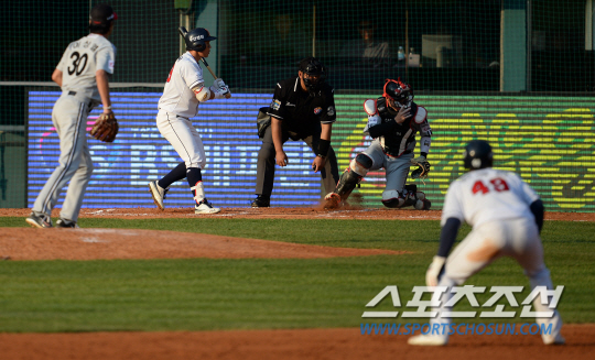 2013 프로야구 플레이오프 4차전 두산과 LG의 경기가 20일 잠실구장에서 열렸다. 7회말 1사 1,2루 두산 이종욱 타석때 LG 이상열의 투구를 포수 현재윤이 막지 못하며 주자를 진루시키고 있다. 잠실=허상욱 기자 wook@sportschosun.com
