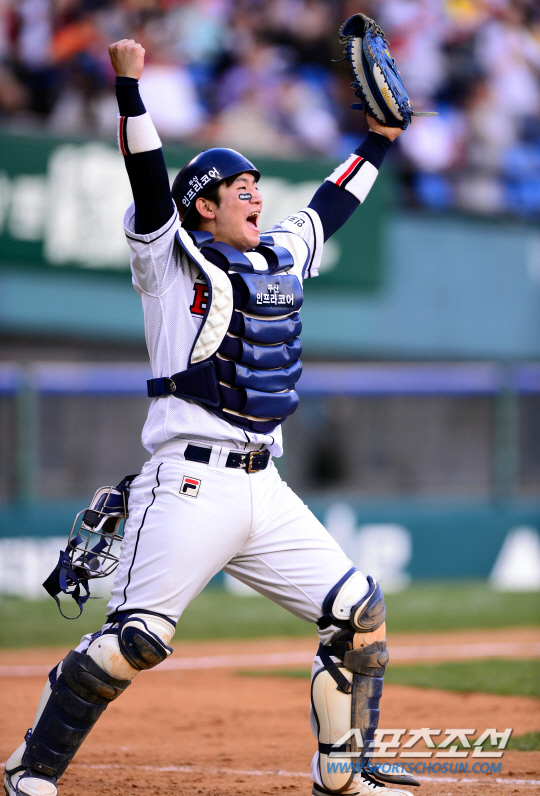 벼랑끝에 몰린 LG와 한국시리즈행을 결말 지으려는 두산이 20일 잠실에서 플레이오프 4차전을 치렀다. 두산의 한국시리즈 진출 1등 공신 최재훈이 LG 마지막 타자가 아웃되는 순간 환호하며 좋아하고 있다. 잠실=조병관기자 rainmaker@sportschosun.com/2013.10.20/