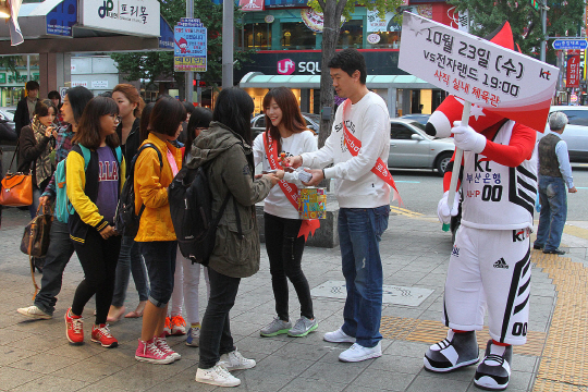 특히 KT 구단은 요즘 부산 시내 거리에서 치열한 가두 홍보전을 펼치는 중이다. 부산 서면, 남포동 등 번화가를 찾아다니며 경기 안내 홍보물을 나눠주고 눈길끌기 이벤트를 펼치는 등 안간힘을 쓰고 있다.
