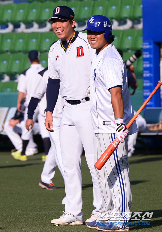 삼성 라이온즈 중심 타자 박석민(28)은 경기전 말을 하고 싶지 않다고 했다. 삼성 라이온즈와 두산 베어스의 2013 프로야구 한국시리즈1차전 경기가 24일 대구 시민운동장에서 열렸다. 경기전 두산 김현수가 삼성 박석민과 반갑게 인사를 나누고 있다. 대구=최문영 기자 deer@sportschosun.com /2013.10.24/