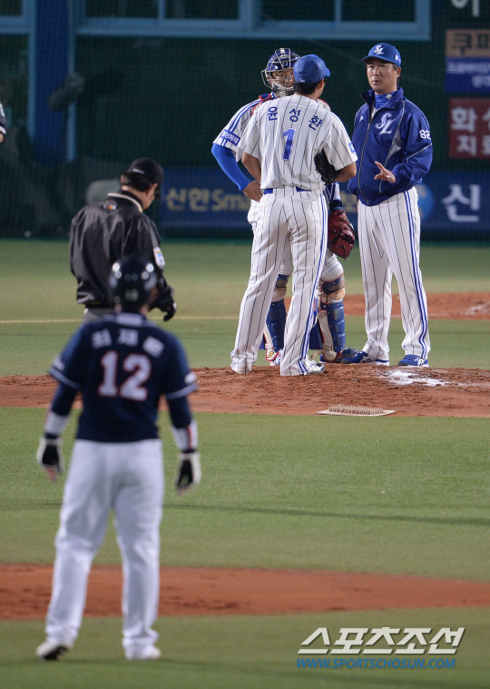 윤성환은 1-0으로 앞선 2회초 집중타를 맞고 3실점했다. 2사 1,2루에서 연속으로 적시타 3방을 맞았다. 8번과 9번 하위 타순의 최재훈 손시헌 그리고 1번 이종욱에게 단타를 맞았다. 24일 오후 대구 시민야구장에서 2013 프로야구 한국시리즈 1차전 두산과 삼성의 경기가 열렸다. 2회초 2사 1,3루서 두산 손시헌에게 적시타를 허용한 삼성 윤성환이 마운드에 오른 김태한 코치와 이야기를 나누고 있다. 대구= 김경민 기자 kyungmin@sportschosun.com