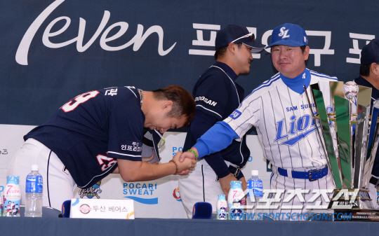 23일 오후 대구 시민체육관에서 삼성과 두산이 격돌하는 2013 프로야구 한국시리즈 미디어데이가 열렸다. 미디어데이에는 한국시리즈에 직행한 삼성의 류중일 감독과 배영수, 최형우, 준플레이오프와 플레이오프를 거친 두산 김진욱 감독, 유희관, 홍성흔 등이 참석해 공식기자회견과 포토타임을 가졌다. 미디어데이가 끝난 후 두산 유희관(왼쪽)과 삼성 류중일 감독이 악수를 나누고 있다. 대구= 김경민 기자 kyungmin@sportschosun.com / 2013.10.23.