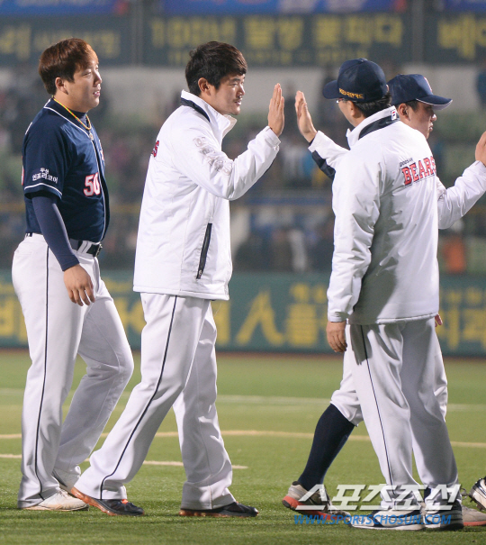 포스트시즌에선 한 경기가 곧 결승전이다. 한 타자, 한 이닝이 끝날 때마다 아쉬움의 탄식과 기쁨의 환호성이 터진다. 진 쪽은 사소한 것도 불만이고, 이긴 쪽은 모든 게 다 아름다워 보인다. 담당기자가 잠시 이성을 내려놓고 철저히 팬의 눈으로 철저히 편파적인 관전평을 썼다. 팬과 공감하는 편파 해설, 용감한 관전평이다.삼성 라이온즈와 두산 베어스의 2013 프로야구 한국시리즈1차전 경기가 24일 대구 시민운동장에서 열렸다. 두산 김진욱 감독이 팀의 7대1 승리를 확정지은후 승리투수 노경은과 하이파이브 하고있다. 대구=최문영 기자 deer@sportschosun.com /2013.10.24/