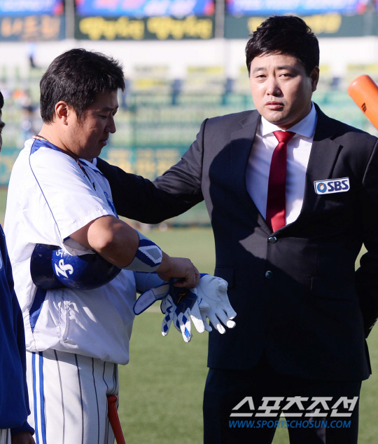 삼성 라이온즈 좌익수 최형우는 24일 두산과의 한국시리즈 1차전에서 호수비를 했다. 김현수의 홈런성 타구를 펜스에 옆구리를 부딪치면서 잡아냈다. 그리고 그라운드에 쓰러졌지만 툭툭 털고 일어났다. 삼성 라이온즈와 두산 베어스의 2013 프로야구 한국시리즈2차전 경기가 25일 대구 시민운동장에서 열렸다. 경기전 양준혁 해설위원이 삼성 최형우에게 이야기를 건네고 있다. 대구=최문영 기자 deer@sportschosun.com /2013.10.25/