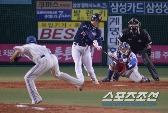 고무링과의 작별과 함께 타이밍을 빠르게 가져가고 있는 김현수. 25일 2차전에서도 불같은 강속구를 던지는 삼성 선발 벤덴헐크와 풀카운트 승부 끝에 좌전 안타로 팀의 마수걸이 안타를 기록했다.