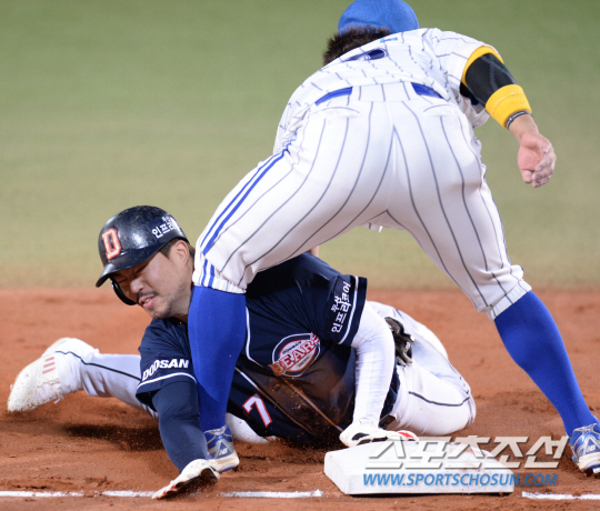 이후 오재원이 좌선상 2루타를 날리고, 과감한 3루 도루를 시도했다. 세이프. 그러나 헤드 퍼스트 슬라이딩 과정에서 오재원의 어깨와 삼성 3루수 박석민의 다리와 충돌했다. 한참을 쓰러져 있던 오재원은 결국 일어났지만, 최재훈의 내야 땅볼에 홈으로 들어오지 못했다.
