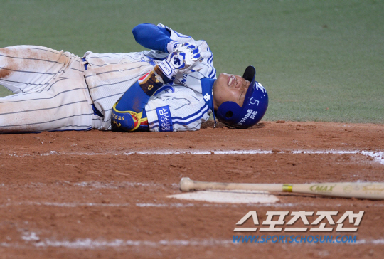 삼성 라이온즈와 두산 베어스의 2013 프로야구 한국시리즈2차전 경기가 25일 대구 시민운동장에서 열렸다. 삼성 7회말 2사에서 정병곤이 두산 오현택의 볼에 맞아 고통스러워 하고 있다. 대구=최문영 기자 deer@sportschosun.com