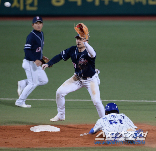 25일 오후 대구 시민야구장에서 2013 프로야구 한국시리즈 2차전 두산과 삼성의 경기가 열렸다. 연장 10회말 무사 1루서 1루주자 정형식이 박석민 타석 때 2루 도루에 성공하고 있다. 대구= 김경민 기자 kyungmin@sportschosun.com / 2013.10.25.