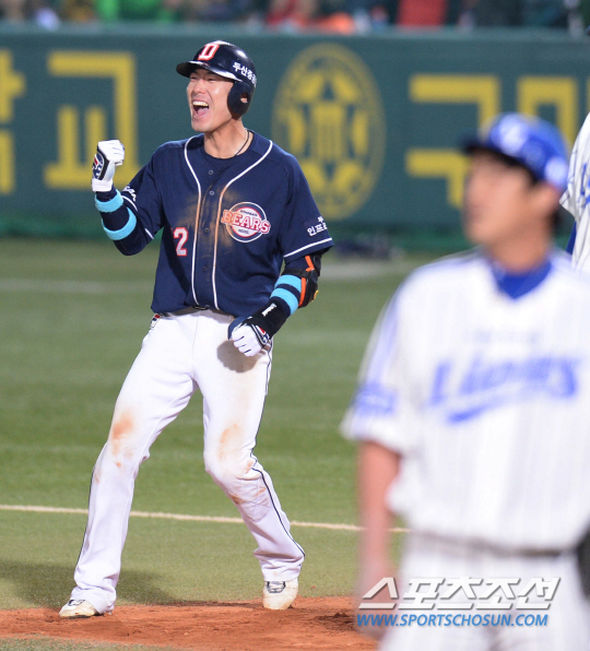 삼성 라이온즈와 두산 베어스의 2013 프로야구 한국시리즈2차전 경기가 25일 대구 시민운동장에서 열렸다. 두산 8회초 2사 1,3루 김재호가 1타점 적시안타를 치고 1루에서 포효하고 있다. 대구=최문영 기자 deer@sportschosun.com /2013.10.25/
