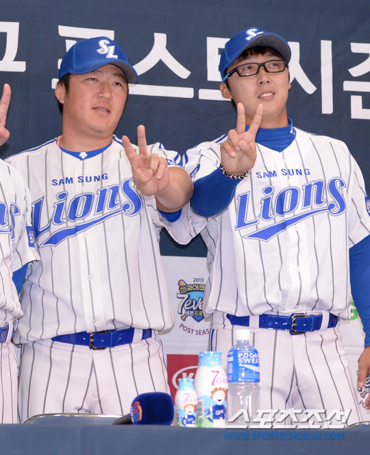 23일 오후 대구 시민체육관에서 삼성과 두산이 격돌하는 2013 프로야구 한국시리즈 미디어데이가 열렸다. 미디어데이에는 한국시리즈에 직행한 삼성의 류중일 감독과 배영수, 최형우, 준플레이오프와 플레이오프를 거친 두산 김진욱 감독, 유희관, 홍성흔 등이 참석해 공식기자회견과 포토타임을 가졌다. 미디어데이에서 '한국시리즈가 몇차전에서 끝날거 같냐'는 사회자의 질문에 삼성 최영수와 배영수가 손가락을 들어 보이고 있다. 대구= 김경민 기자 kyungmin@sportschosun.com / 2013.10.23.