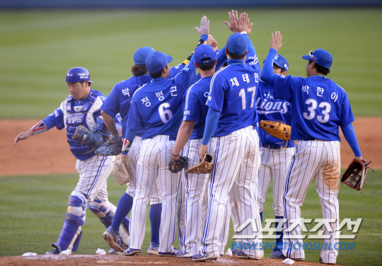 27일 오후 서울 잠실야구장에서 2013 프로야구 한국시리즈 3차전 삼성과 두산의 경기가 열렸다. 3차전에서 3대2로 승리한 삼성 선수들이 마운드 위에서 하이파이브를 나누고 있다. 잠실= 김경민 기자 kyungmin@sportschosun.com / 2013.10.27. |