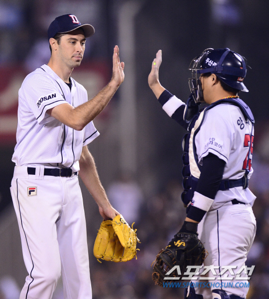그랬던 핸킨스가 가을이 되자 자신에게 딱 맞는 옷을 찾아 입었다. 큰 경기에서는 타자, 투수 모두 심박수가 올라가고 조급해진다. 누가 평정심을 찾느냐의 싸움. 타자는 평소 칠 수 있는 공에 헛방망이질을 하고, 투수는 말도 안되는 코스로 공을 던지게 된다. 이 측면에서 핸킨스가 빛났다. 구위가 확 좋아진게 아니었다. 토종 선수들이 큰 경기 압박감을 이기지 못하고 있을 때 핸킨스는 차분했다. 스트라이크존에 꾸준하게 공을 넣었고, 타자를 유인하는 변화구의 제구도 괜찮았다. 특히, 준플레이오프에서 홍상삼 윤명준 등 젊은 불펜 투수들이 집단 '멘붕'에 빠졌을 때 핸킨스마저 중심을 잡아주지 못했다면 두산의 가을야구는 일찌감치 끝났을지도 모른다. 시리즈전적 1-2로 뒤지던 4차전 핸킨스의 무실점투가 아니었다면 최재훈의 극적인 역전 투런 홈런이 나올 수 있었을까.
