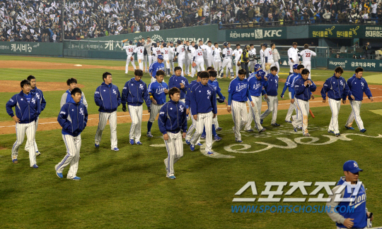 28일 잠실구장에서 2013프로야구 한국시리즈 4차전 두산과 삼성의 경기가 열렸다. 두산이 삼성에 2대1로 승리하며 시리즈 전적 3대1로 앞서게 됐다. 경기 종료 후 아쉬운 패배를 기록한 삼성 선수들이 그라운드를 나서고 있다. 잠실=송정헌 기자 songs@sportschosun.com