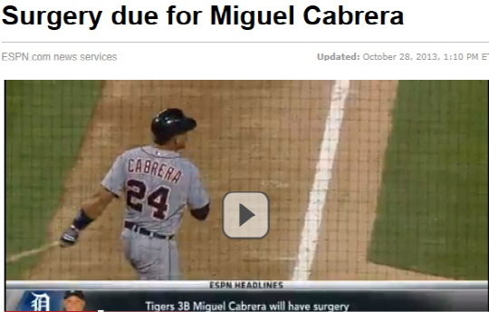 개운치 못한 마무리와 통증. 카브레라는 시리즈 후 인상을 구기면서 생활하고 있다. 의사로부터 수술 권고를 받았다. 카브레라는 현지 언론과의 인터뷰를 통해 "30일(한국시간) 필라델피아에서 ?어진 근육을 재건하는 수술을 받는다. 수술을 안 받으면 향후 선수 생활에 지장이 있다고 해서 고심 끝에 수술을 받기로 결정했다"고 설명했다. 그는 "정확히 어떤 수술인지 잘 알지도 못하고, 알고 싶지도 않다. 그저 빨리 낫기만을 바랄 뿐"이라며 불안감을 감추지 못했다. 쉽고 간단한 수술은 아니다. 수술 후 선수 활동에 어떤 영향을 미칠지도 장담할 수 없다. 수술대에 오르는 리그 최고 타자의 불안감. 카브레라의 복귀 시점은 미정이다.