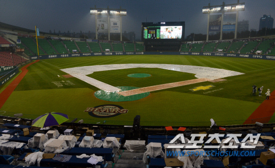 5시35분 현재 빗줄기가 점점 약해지고 있어 아직 경기 여부에 대한 판단을 내리기는 어려울 것으로 보인다. <스포츠조선닷컴>