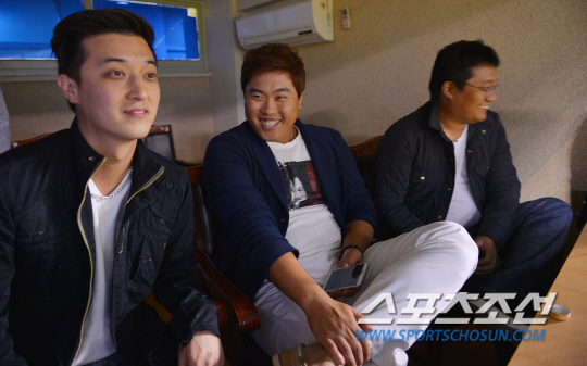 기적의 포스트시즌을 보내고 있는 두산과 벼랑 끝에 몰린 삼성의 한국시리즈 5차전 경기가 29일 잠실 야구장에서 펼쳐 졌다. 이날 귀국한 LA 다저스 류현진이 마틴 김(왼쪽)과 함께 잠실 야구장을 찾아 경기를 관람하고 있다. 잠실=조병관기자 rainmaker@sportschosun.com/2013.10.29/