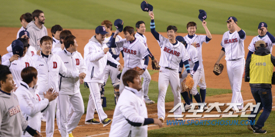 28일 오후 서울 잠실야구장에서 2013 프로야구 한국시리즈 4차전 삼성과 두산의 경기가 열렸다. 2대1로 4차전에 승리한 두산 선수들이 관중들에게 인사하고 있다. 잠실= 김경민 기자 kyungmin@sportschosun.com