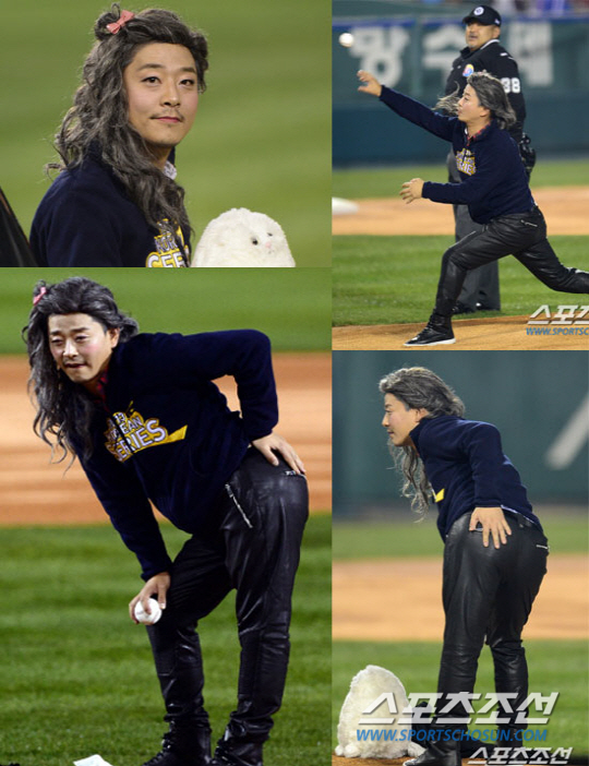 이어 마운드 위에 오른 김준호는 '자나'를 옆에 내려놓은 뒤 갑자기 검은 치마를 벗어 던지고는 가죽 바지를 입은 채 요염한 포즈를 선보이며 시구를 했다.
