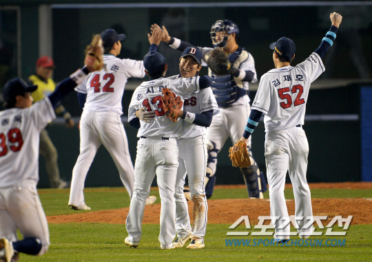 두산과 삼성의 2013 프로야구 한국시리즈 4차전이 28일 잠실구장에서 열렸다. 9회초 2사 2,3루 삼성 진갑용을 내야땅볼로 처리하며 2대1 승리를 지켜낸 두산 선수들이 환호하고 있다. 잠실=허상욱 기자 wook@sportschosun.com/2013.10.28/ |