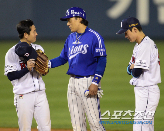 삼성 라이온즈와 두산 베어스의 2013 한국시리즈 5차전이 28일 잠실구장에서 열렸다. 9회초 무사 1,2루 삼성 김태완 타석 때 2루주자 이승엽이 두산 유격수 손시헌과 이야기를 나누고 있다. 잠실=정재근기자 cjg@sportschosun.com