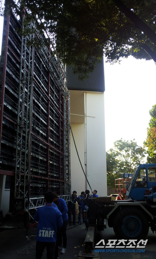 모두 112개의 영상판과 영상신호 전송용 케이블이 부착돼야 달 전광판이 완성된다. 놀레벤트의 배상현 차장은 "한국시리즈 1, 2차전 이후 6, 7차전까지 경기가 없을 때는 안전과 장비 보호를 위해 분해해 보관한다. 다시 조립하는데 꼬박 하루가 걸린다"고 말했다.