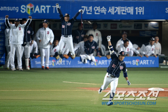 배트 중심에 정확히 걸린 타구. 삼성 우익수 박한이가 펜스를 향해 뛰다가 멈춰선 채로 관중석에 떨어지는 홈런을 바라만 봤다. 정수빈의 선두타자 홈런은 한국시리즈 사상 3번째 기록이다.