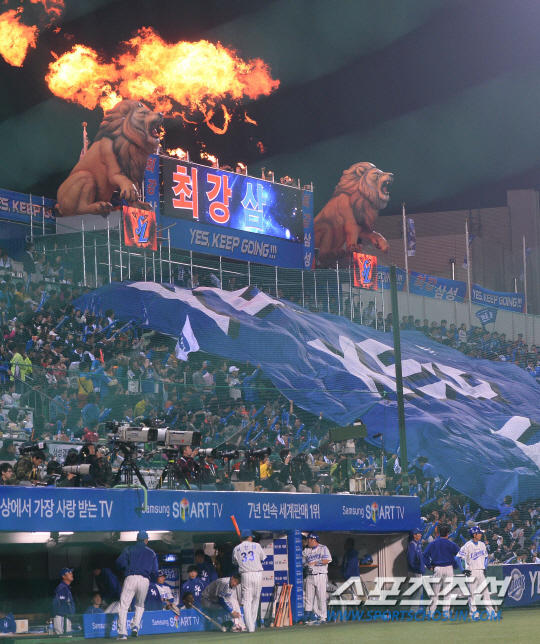 31일 대구 삼성과 두산의 한국시리즈 6차전에 관중 1만명이 입장했다. 포스트시즌 11경기 연속 매진이다. 또 한국시리즈 37경기 연속 매진 기록이다. 삼성 라이온즈와 두산 베어스의 2013 프로야구 한국시리즈1차전 경기가 24일 대구 시민운동장에서 열렸다. 관중석을 가득 채운 삼성팬들이 뜨거운 응원전을 펼치고 있다. 대구=최문영 기자 deer@sportschosun.com