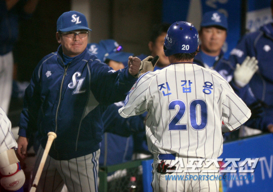 31일 오후 대구 시민야구장에서 2013 프로야구 한국시리즈 6차전 두산과 삼성의 경기가 열렸다. 3회말 1사 3루서 3루주자 삼성 진갑용이 배영섭의 중견수 플라이 때 홈에 들어와 류중일 감독과 주먹을 맞추고 있다. 대구=김경민 기자kyungmin@sportschosun.com / 2013.10.31.