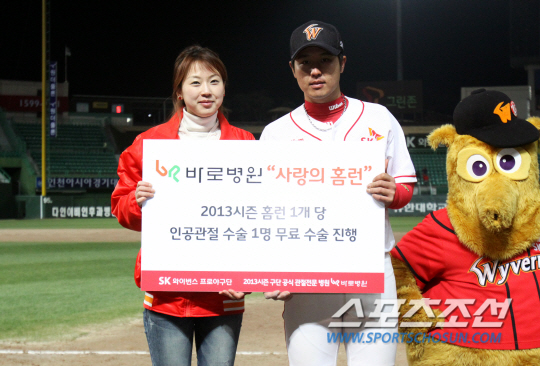 SK과 바로병원은 1일부터 인공관절(퇴행성 관절염) 무료 수술 수혜자를 선착순으로 모집한다. 바로병원과 SK는 올시즌 최 정의 홈런 개수(28개)와 문학구장 좌측 외야에 설치된 바로병원 날개존으로 넘어간 SK 선수의 홈런 개수(6개)를 더한 34개 만큼 환자들의 인공관절을 무료로 수술해 주기로 했다. 이번 행사는 장애인, 생활보호대상자, 저소득층 등을 대상으로 모집하며, 신청을 원하는 지원자는 SK 와이번스 마케팅팀 CSR 담당부서로 접수하면 된다.
