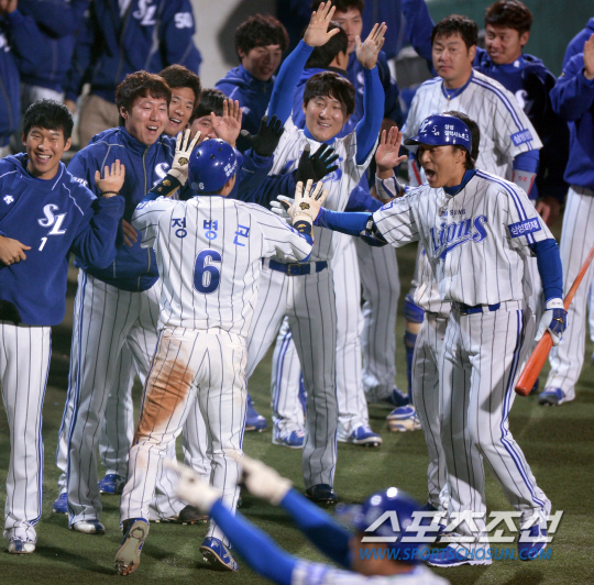 삼성은 이번 한국시리즈에서 0%의 우승 확률을 뒤집었다. 두산에 4차전까지 1승3패로 끌려갔다. 한 번만 패하면 끝인 상황에서 5차전부터 7차전까지 3연승으로 시리즈를 뒤집었다. 국내 프로야구에서 이런 기적의 드라마를 쓴 건 삼성이 처음이다. 1일 오후 대구 시민야구장에서 2013 프로야구 한국시리즈 7차전 두산과 삼성의 경기가 열렸다. 6회말 1사 만루서 3루주자 정병곤이 최형우의 3루수 앞 땅볼 때 이원석의 악송구를 틈타 홈에서 세이프된 후 동료들과 환호하고 있다. 대구=김경민 기자kyungmin@sportschosun.com / 2013.11.01.