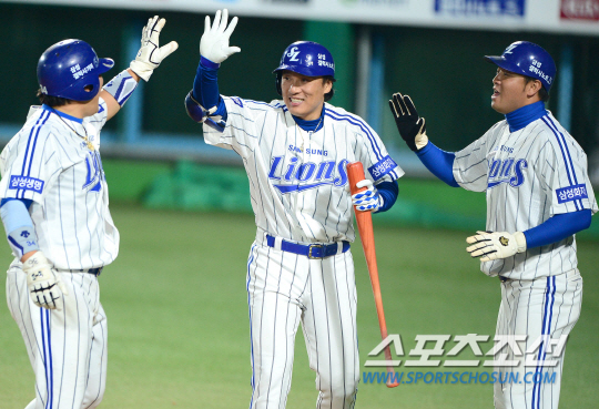1일 대구시민구장에서 2013 한국프로야구 한국시리즈 7차전 삼성과 두산의 경기가 열렸다. 6회 1사 2,3루에서 박석민의 적시타 때 득점에 성공한 채태인, 최형우가 이승엽과 하이파이브를 나누고 있다. 대구=송정헌 기자 songs@sportschosun.com/2013.11.1