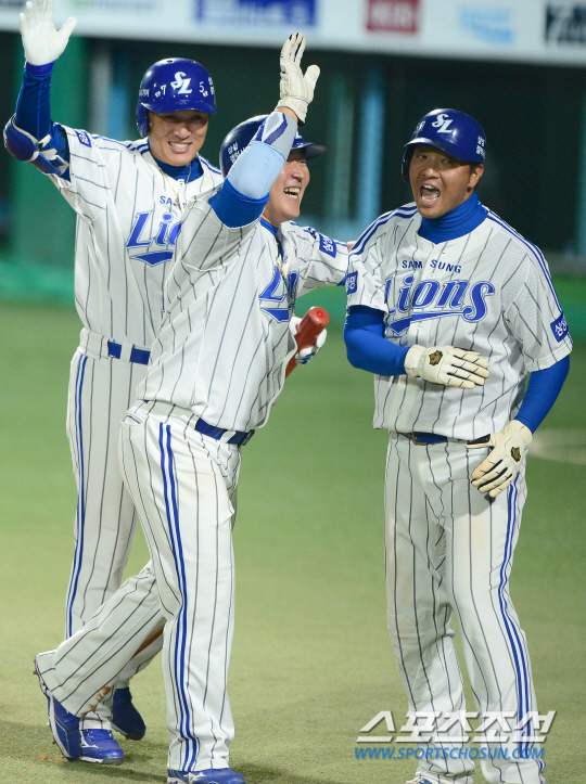 1일 대구시민구장에서 2013 한국프로야구 한국시리즈 7차전 삼성과 두산의 경기가 열렸다. 6회 1사 2,3루에서 박석민의 적시타 때 득점에 성공한 채태인, 최형우가 이승엽과 하이파이브를 나누고 있다. 대구=송정헌 기자 songs@sportschosun.com/2013.11.1