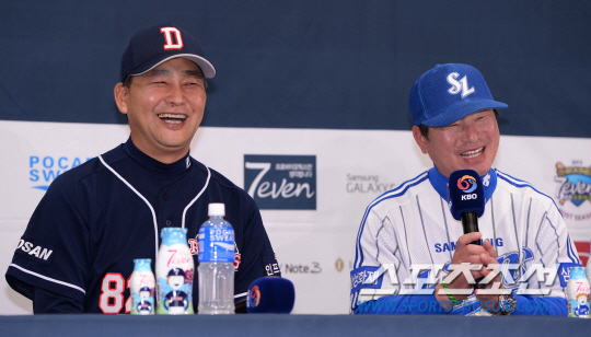 | 지난달 23일 대구 시민체육관에서 열린 한국시리즈 미디어데이에서 두산 김진욱 감독과 삼성 류중일 감독이 인터뷰 도중 활짝 웃고 있다. 대구= 김경민 기자 kyungmin@sportschosun.com |