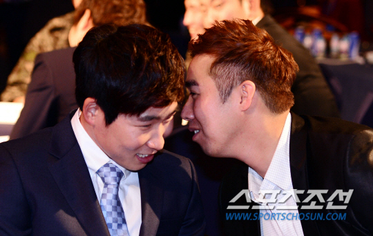 2013 프로야구 최우수선수, 최우수 신인선수 선정및 각 부문별 시상식이 4일 인터컨티넨탈 호텔에서 열렸다. 신인왕 후보에 오른 NC 이재학(왼쪽)과 두산 유희관이 나란히 앉아 이야기를 나누고 있다. 조병관기자 rainmaker@sportschosun.com