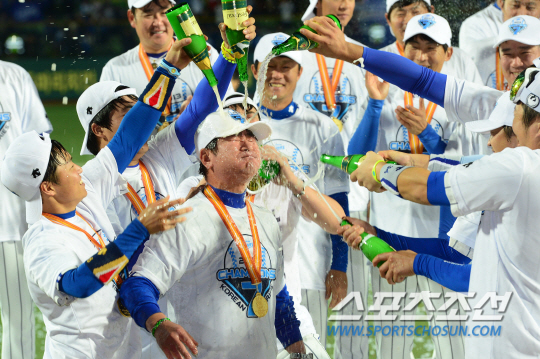 삼성 라이온즈가 2013 한국시리즈 우승을 차지했다. 1일 대구구장에서 열린 한국시리즈 7치전에서 삼성은 두산을 7-3으로 꺾고 프로야구 사상 최초로 한국시리즈 3연패를 달성했다. 감독상을 받은 류중일 감독이 샴페인 세례를 받고 있다. 대구=정재근기자 cjg@sportschosun.com/2013.11.01/