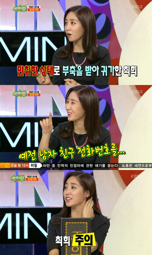 이날 최희 아나운서는 "술자리에서 만취해 친구가 부축해서 집에 데려다 줬다. 근데 내가 문을 열어줘야 하는데 자꾸 현관문 비밀번호가 틀렸다"며 "알고 보니 자꾸 내가 예전 남자친구 전화번호를 누르고 있었다"며 실수담을 털어놨다.