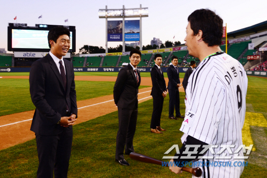 2위 자리를 지키려 안간힘을 쓰는 LG와 시즌 막판 힘을 내고 있는 한화가 2일 잠실에서 만났다. 이날 경기에 앞서 올해 LG에 지명된 신인들이 팬들에게 인사를 하는 자리가 마련 됐다. LG에 1차 지명되며 팬들의 기대를 한몸에 받고 있는 임지섭(왼쪽)이 운동장에 나오자 이병규가 관심을 보이며 이야기를 하고 있다. 잠실=조병관기자 rainmaker@sportschosun.com/2013.10.02/