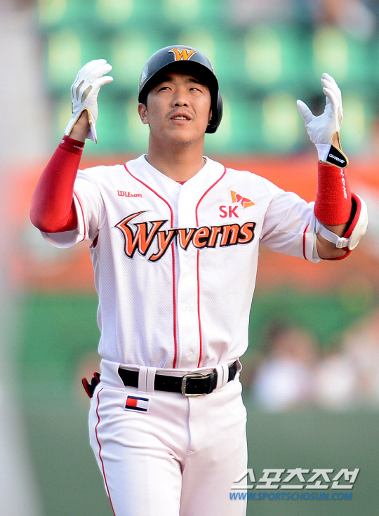 NC 다이노스와 SK 와이번스의 2013 프로야구 경기가 8일 인천구장에서 열렸다. 2회말 2사 만루 SK 정근우가 싹쓸이 2루타를 치고 기뻐하고 있다. 인천=정재근기자 cjg@sportschosun.com