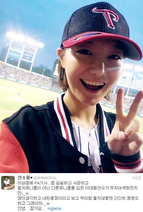 프로야구 LG 트윈스 팬으로 알려진 배우 신소율이 기아행을 확정지은 이대형에게 인사를 건넸다.