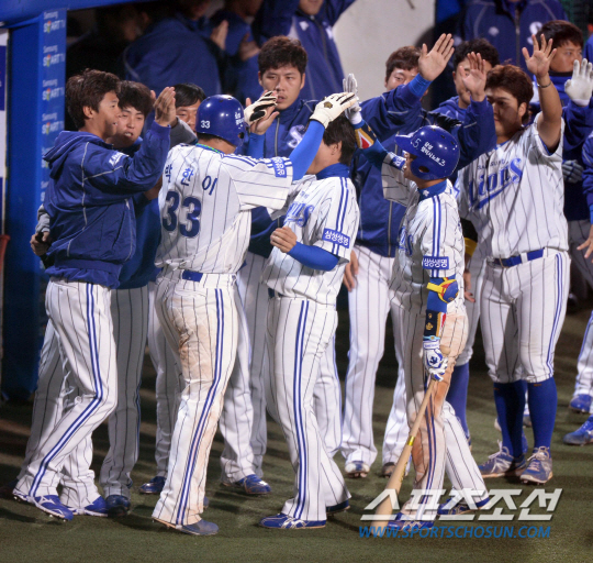 1일 오후 대구 시민야구장에서 2013 프로야구 한국시리즈 7차전 두산과 삼성의 경기가 열렸다. 5회말 1사 만루서 삼성 이승엽의 적시타 때 홈에 들어온 3루주자 박한이가 동료들과 환호하고 있다. 대구=김경민 기자kyungmin@sportschosun.com